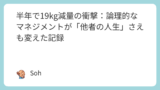 • 16週目: 58kg (−14.8kg 到達)