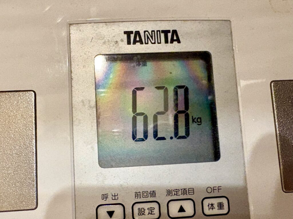 冷え込んだ朝、体重計が示した数字は 62.8 kg でした。