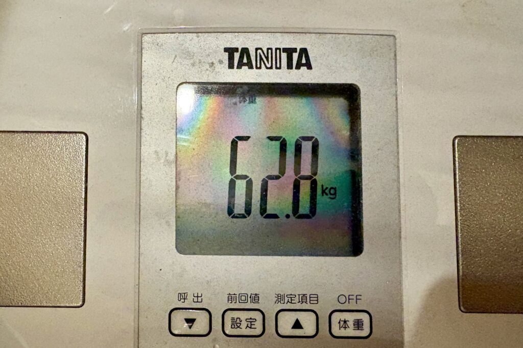 一昨日から続いていた体重「63.5kg」という強固な停滞の壁。どれだけ体を動かしても、どれだけ計算された食事を摂っても動かなかった針が、一気に0.7kgも振り切れていました。