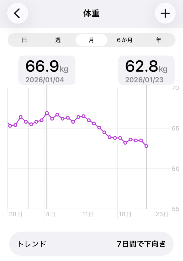 思い返すと、2026年1月4日、私の体重は「66.9kg」でした。いわゆる「正月太り」の状態だったんです。